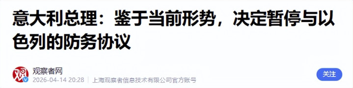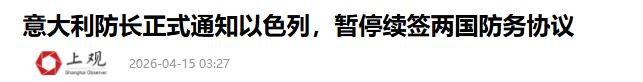4月14日,意大利正式宣布,暂停与以色列2016年生效的防务协议自动续签。这份协议每五年自动续期,涵盖军事装备和技术合作,是两国军事往来的重要纽带。